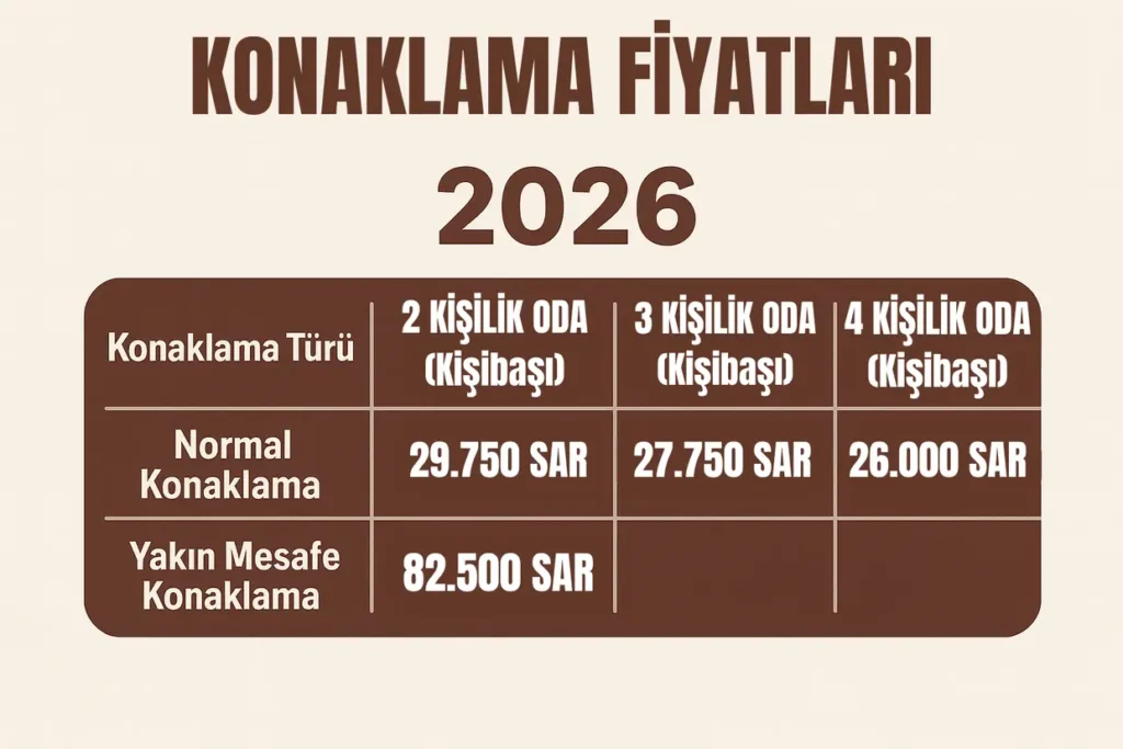 2026 yılı için Diyanet İşleri Başkanlığı tarafından belirlenen hac ücretleri, konaklama türüne, otel mesafesine ve odadaki kişi sayısına göre değişiklik göstermektedir. Ücretler, Suudi Arabistan Riyali (SAR) olarak belirlenmiş olup, ödeme seçenekleri peşin veya üç taksitli olarak sunulmaktadır.(Hac ve Umre Genel Müdürlüğü)